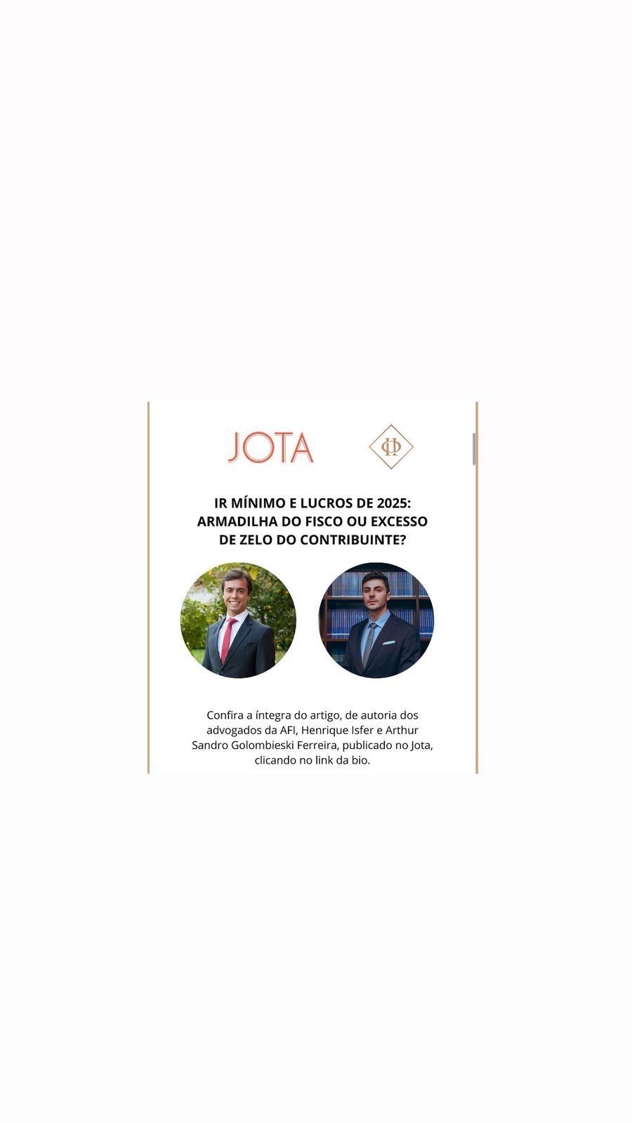 Na semana do dia 18.12.2025 foi publicado, no Jota, o artigo dos advogados do setor tributário da AFI, Henrique Isfer e Arthur Sandro Golombieski Ferreira, intitulado “IR mínimo e lucros de 2025: armadilha do fisco ou excesso de zelo do contribuinte?”, o qual trata das alterações da Lei n.º 15.270/2025, que dispõe sobre a reforma do imposto de renda.